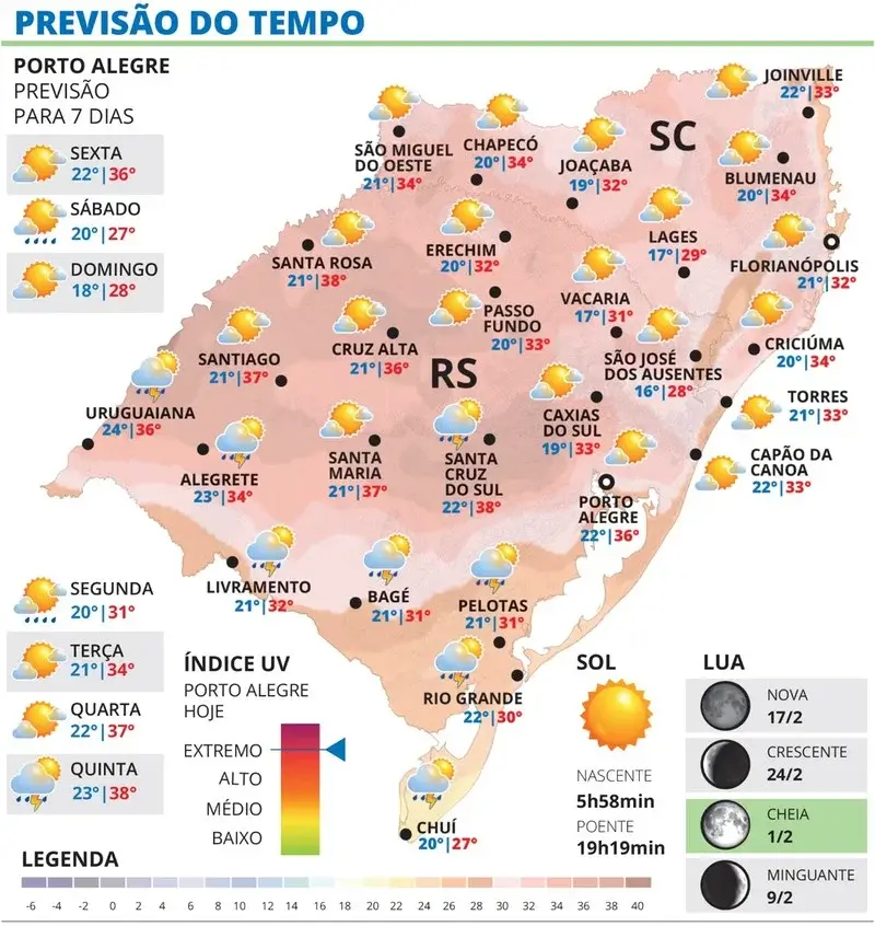 De acordo com a MetSul Meteorologiaainda nesta sexta, a frente fria começa a ingressar pela fronteira com o Uruguai e o extremo Sul com chuva até o fim do dia no Sul, Oeste e o Leste gaúcho de forma localizada, não se descartando temporais isolados devido ao intenso calor.