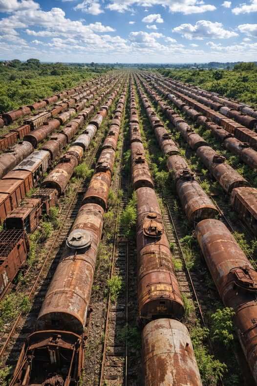 UMA IMENSA FILEIRA DE TRENS ESQUECIDOS EXPÕE O ABANDONO FERROVIÁRIO NO RIO GRANDE DO SUL