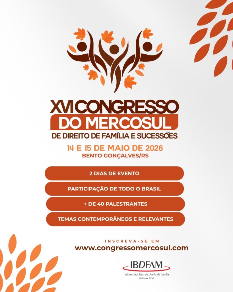 O Instituto Brasileiro de Direito das Famílias e Sucessões Seccional Rio Grande do Sul (IBDFAM/RS) realizará a XVI edição do Congresso do Mercosul de Direito de Família e Sucessões, considerado o maior evento anual da área na América Latina. O encontro acontecerá no Hotel Dall’Onder, em Bento Gonçalves, na Serra Gaúcha, nos dias 14 e […]