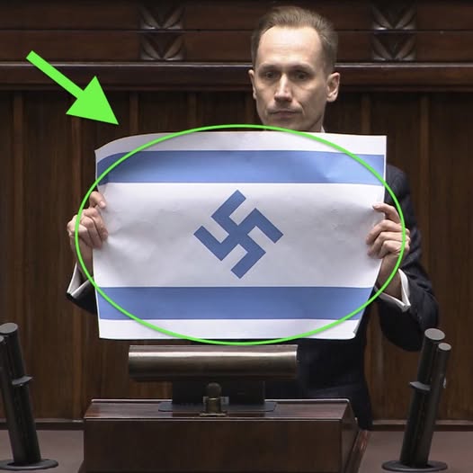 POLÔNIA: DEPUTADO EXIBE BANDEIRA ISRAELENSE COM SUÁSTICA E CHAMA O ESTADO DE “TERCEIRO REICH”