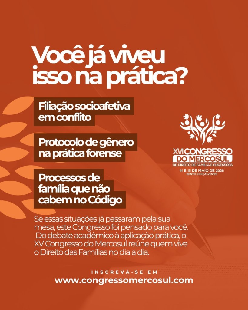 Inscrições e programação completa: https://ibdfam.org.br/eventos/3109/XVI+Congresso+do+Mercosul+de+Direito+de+Fam%C3%ADlia+e+Sucess%C3%B5es
