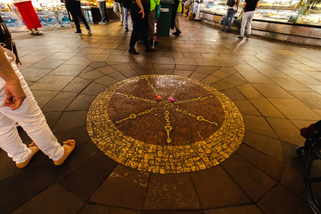 Ao chegar na encruzilhada dos quatro corredores centrais há um mosaico de pedras e bronze. Não estranha se tu sentir uma vibração diferente, pois é aí que está o Bará do Mercado. Para as religiões de matriz africana, o orixá tem o poder de abrir caminhos e foi parar ali depois de ser assentado, ou seja, fixado em algum objeto através de rituais. O Bará também é o senhor da fartura e do trabalho, por isso, muita gente vai até o local e deixa moedas e/ou presentes para ele. Existe, ainda, a crença de que uma energia protege o prédio há gerações (talvez isso explique a preservação do prédio, mesmo depois de tantos incidentes). Há duas versões sobre quem fez o assentamento. A primeira é de que foram os escravos na época da construção. Alguns religiosos, porém, acreditam que foi obra do Príncipe Custódio, que chegou ao Brasil quando o Mercado já existia.
