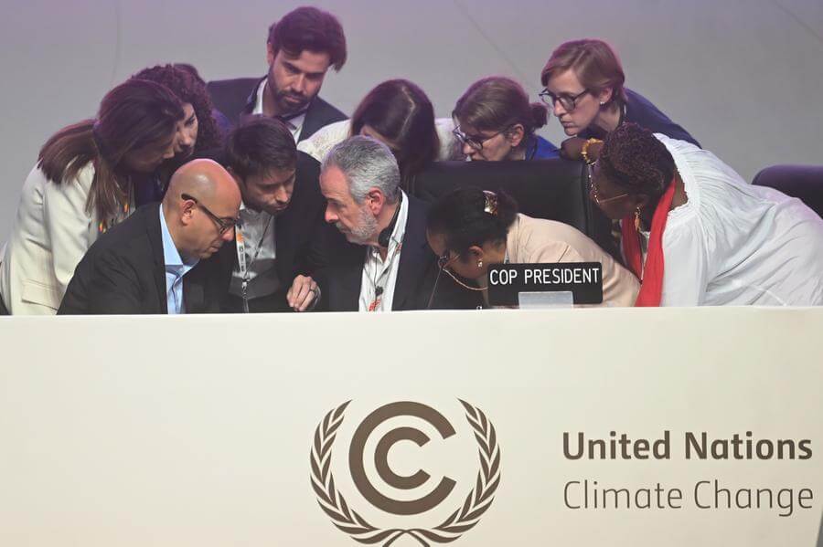 (251123) — BELEM, Nov. 23, 2025 (Xinhua) — President of the 30th United Nations Climate Change Conference (COP30) Andre Correa do Lago (2nd L, front) discusses with UN Climate Change Executive Secretary Simon Stiell (1st L, front) and other staff members during a plenary session of the COP30 in Belem, Brazil, on Nov. 22, 2025. The COP30 on Saturday approved a document titled “Global Mutirao: Uniting humanity in a global mobilization against climate change” during its closing session. (Photo by Lucio Tavora/Xinhua)