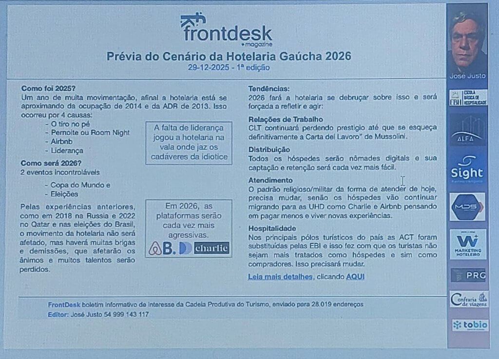 Como foi 2025? Um ano de muita movimentação, afinal a hotelaria está se aproximando da ocupação de 2014 e da ADR de 2013. Isso ocorreu por 4 causas:- O tiro no pé- Pernoite ou Room Night- Airbnb- Liderança Como será 2026? 2 eventos incontroláveis- Copa do Mundo e – Eleições Pelas experiências anteriores, como em 2018 na Russia e 2022 no Qatar e nas eleições do Brasil, o movimento da hotelaria não será afetado, mas haverá muitas brigas e demissões, que afetarão os ânimos e muitos talentos serão perdidos. A falta de liderança jogou a hotelaria na vala onde jaz os cadáveres da idiotice Em 2026, as plataformas serão cada vez mais agressivas. Tendências: 2026 fará a hotelaria se debruçar sobre isso e será forçada a refletir e agir: Relações de Trabalho CLT continuará perdendo prestigio até que se esqueça definitivamente a Carta del Lavoro” de Mussolini. Distribuição Todos os hóspedes serão nômades digitais e sua captação e retenção será cada vez mais fácil. Atendimento O padrão religioso/militar da forma de atender de hoje, precisa mudar, senão os hóspedes vão continuar migrando para as UHD como Charlie e Airbnb pensando em pagar menos e viver novas experiências. Hospitalidade Nos principais pólos turísticos do país as ACT foram substituídas pelas EBI e isso fez com que os turistas não sejam mais tratados como hóspedes e sim como compradores. Isso precisará mudar.